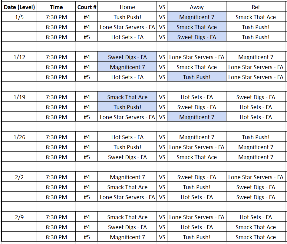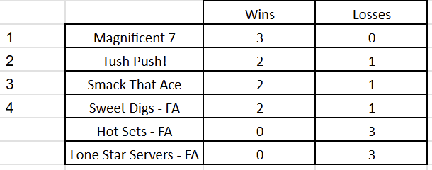 ACES Rule Change – Jerseys: We will be requiring players to wear ACES jerseys for Week 1 and Playoffs (subs/players who did not get their jerseys Week 1 is an exception). Other league jerseys worn through the season will add a 5 point penalty to your 1st Set score.