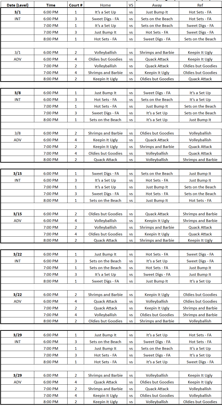 2026 Sunday Sand 4’s Spring Schedule