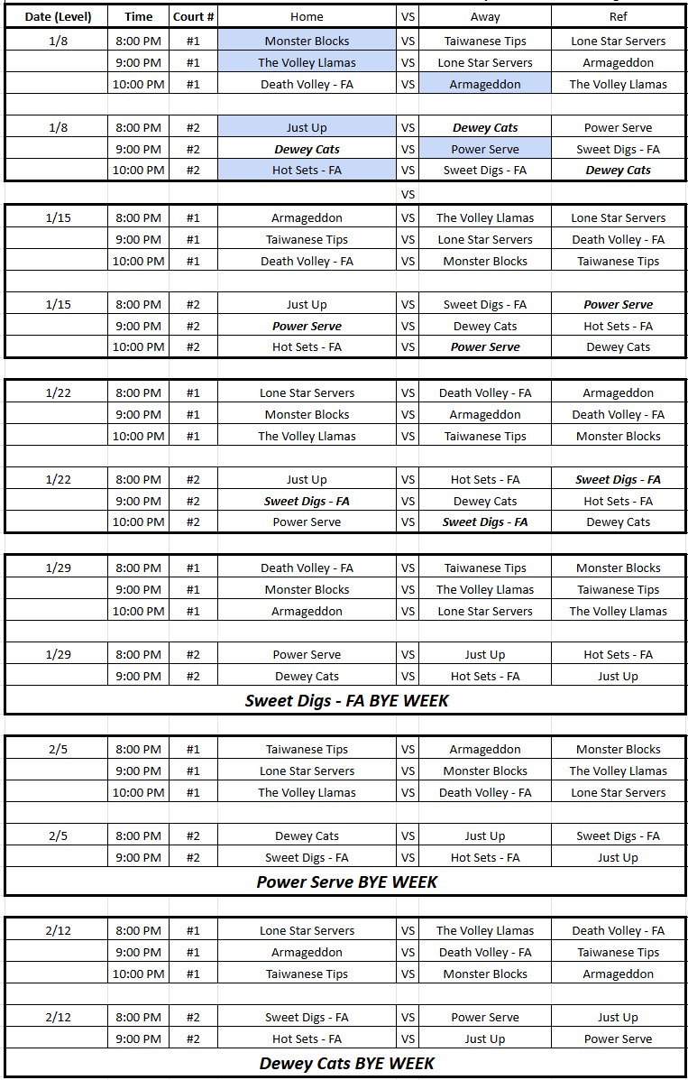 2026 Thursday Indoor 6’s Winter Season Schedule