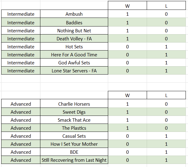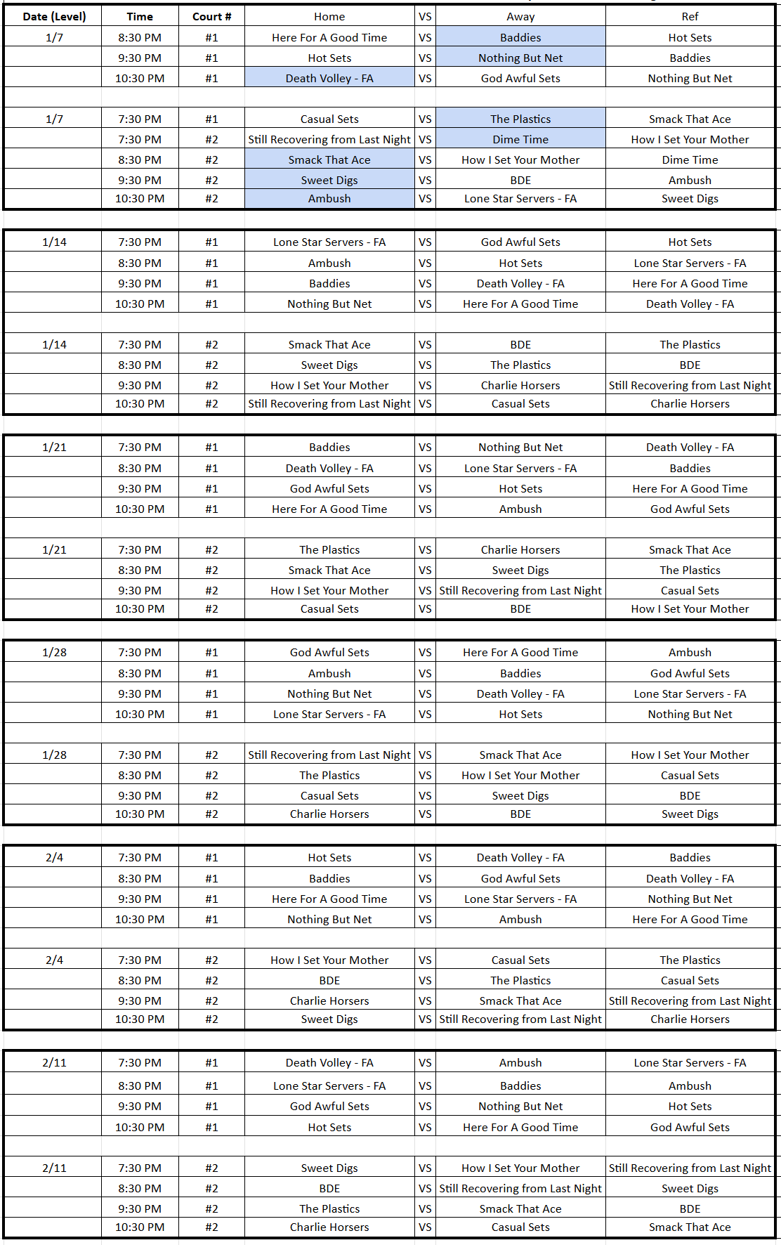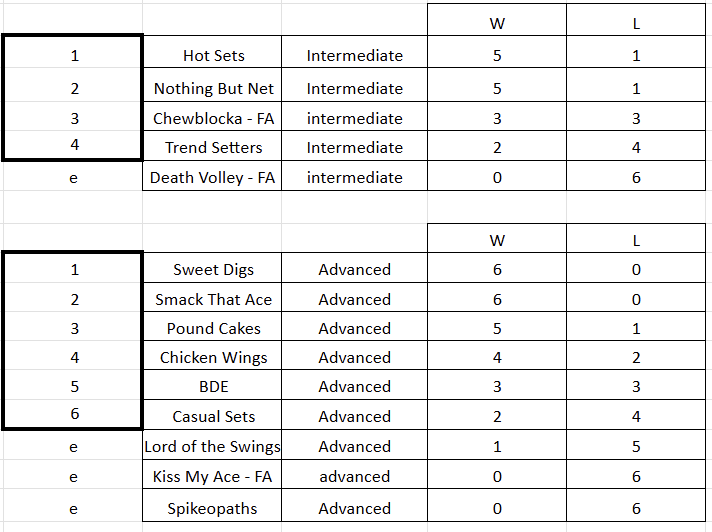 ACES Rule Change – Jerseys: We will be requiring players to wear ACES jerseys for Week 1 and Playoffs (subs/players who did not get their jerseys Week 1 is an exception). Other league jerseys worn through the season will add a 5 point penalty to your 1st Set score.